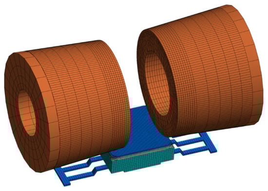 The coupling logic relationships among the various physical fields involved in the entire process are shown in Figure 3. Based on the Figure 3, it can be understood that the physical fields involved in the entire parallel seam welding process can be classified into three categories: electric field, thermal field, and structural field. A localized high-temperature region is generated through Joule heating, which is the result of the combined action of welding current and contact resistance at the contact point. The heat in the high-temperature region is propagated to the surrounding areas through thermal conduction, resulting in an overall temperature rise. The resistivity of the resistive heating region and the distribution of the current are affected by the temperature rise in the device. Thermal deformation and thermal stress within the structure are also induced, thereby further impacting the heat transfer characteristics and current density at the contact location. Because the thermal and electrical properties of the materials in the structure are varied with increasing temperature, the conduction of the thermal and electric fields is also affected. The distribution of the thermal field and electric field is also affected by the displacements and rotations of the structure.