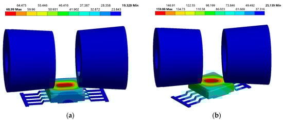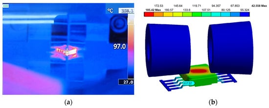 The comparison of the measured temperature of the device at a rotation of 194° during soldering with the simulation results is shown in Figure 10. The infrared temperature measurement showed that the highest temperature in the ceramic was 106.1 °C, while the calculated ceramic temperature in the model was 117.57 °C, resulting in a difference of 10.8% compared to the actual value, and the accuracy of the model calculations is verified.