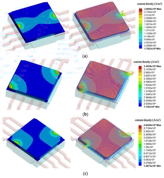 Current density contours of the device at different rotation angles: (a) 0°; (b) 40°; (c) 113°.