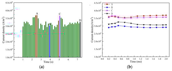 Current density of the device during seam welding: (a) maximum current density per pulse; (b) variation in current density in pulse width (2 ms).