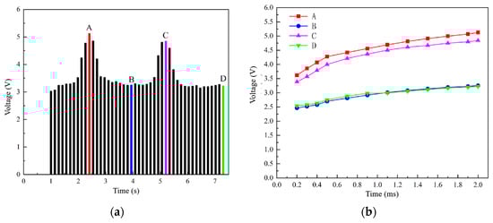 The variation in maximum voltage in the welding process is shown in Figure 13. With the change in the contact point during the welding process, the maximum voltage of each pulse is also varied continuously, and a certain periodicity similar to the current density is exhibited. The voltage is significantly higher when the electrode is located at the rounded corner of the cover plate compared to the straight edge of the cover plate. From Figure 13b, in the comparison of pulses A and D, the voltage is gradually increased during each pulse-width interval (2 ms), which the change in resistance during the seam welding process is illustrated. Since the resistivity of the metallic material is raised with the increase in temperature, the resistance in the circuit is enlarged, thus leading to an increase in the voltage between the electrodes during the pulse-width phase.