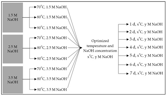 3 sets of 1 L solutions of 1.5 M, 2.5 M, and 3.5 M NaOH were prepared by addition of required mass of NaOH pellets. Those 9 solutions were used for the alkaline hydrothermal treatment optimization study in the following ways: