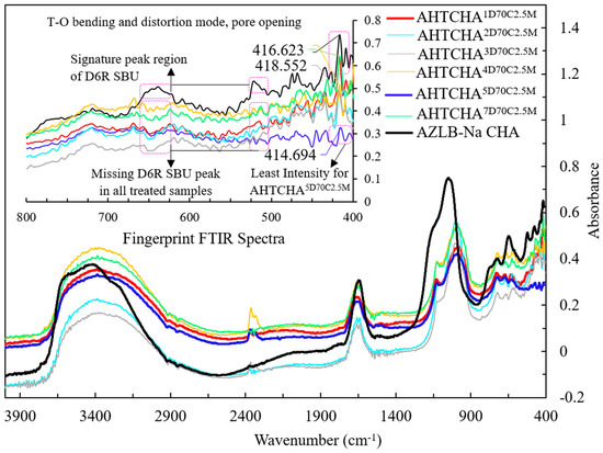 The peak in the spectral range of 300–420 cm−1 is linked to the pore-opening characteristic of the zeolite, playing a crucial role in the framework-structure sensitivity [38]. In Figure 2, a distinct, sharp peak at 414 cm−1 is evident for the AZLB-Na CHA sample. However, for the treated samples, this peak exhibited a lower intensity. At this wavelength, AHTCHA5D70C2.5M exhibited the lowest intensity, leading to speculation that, during alkaline hydrothermal treatment, the destruction of the framework potentially leads to the formation of a denser channel network characterized by a narrower pore opening. This may be the reason for the observed changes in intensity in this spectral range.