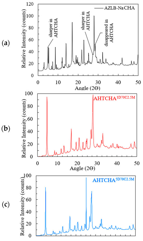 A sharp, newly formed peak at 2θ = 25.15° is observed in Figure 3c, a characteristic peak of analcime (ANA) zeolite. This peak was faint in AHTCHA1D70C2.5M at 2θ = 24.88° but was the most prominent peak in AHTCHA5D70C2.5M, possibly due to longer exposure of AZLB-Na CHA in the experimental environment during preparation. Additionally, a few insignificant peaks of AZLB-Na CHA disappeared in Figure 3b,c; the plot appears much smoother for AHTCHA5D70C2.5M than for AHTCHA1D70C2.5M. The pattern indicates alterations in the crystal structure and composition due to the longer treatment duration, resulting in changes in the XRD pattern and the emergence of a distinct peak associated with a different zeolite phase.