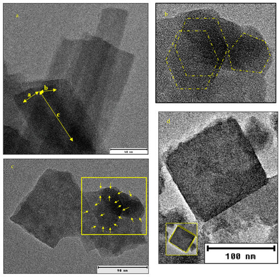 Figure 4d shows a TEM image of AHTCHA5D70C2.5M. The grain boundaries yellow highlighted in the crystal may represent a 2D projection of a triclinic crystal. In Figure 4d, the yellow highlighted edge of the AHTCHA5D70C2.5M crystal exhibits a slight deviation from 90° in its planar angle. This deviation shows a fundamental characteristic of a triclinic crystal system, where . In addition, the two axial lengths in this image are slightly different. Even a small discrepancy in axial lengths (one-thousandth of an Å) aligns with the defining features of a triclinic crystal system where [52].