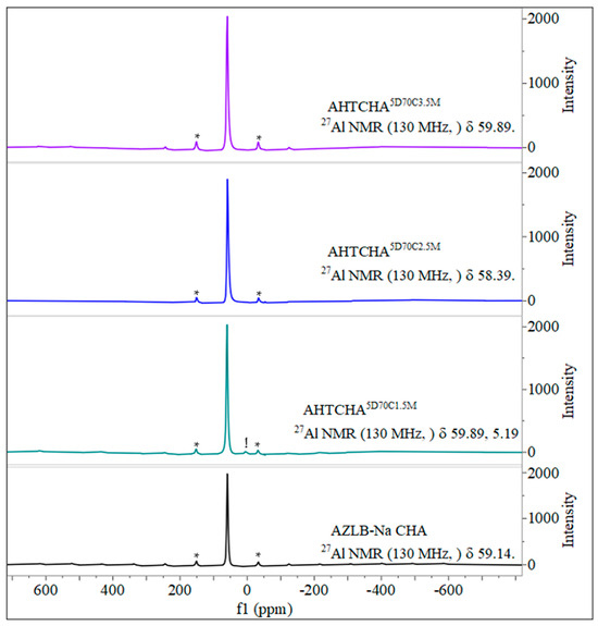 In Al MAS NMR, the tetrahedrally coordinated framework of Al resonates in the range of 50–65 ppm, whereas octahedrally coordinated extra-framework Al typically appears as a resonance line at approximately 0 ppm [55]. As illustrated in Figure 6, the solid-state 27Al MAS NMR resonance peak in the AHTCHA5D70C1.5M sample was observed at approximately 0 ppm (5.19 ppm, marked with an exclamation point) alongside spinning sidebands (marked with asterisks). This observation indicates that treatment. However, in the other two samples, AHTCHA5D70C2.5M and AHTCHA5D70C3.5M, apart from the pair of spinning sidebands, no distinct signal was observed at approximately zero ppm. This absence may be explained by the reinsertion of the extra-framework Al into the lattice, potentially leading to the reformation of an existing zeolitic crystal framework into a different structure. Realumination during hydrothermal treatment of zeolites has been observed [56,57].