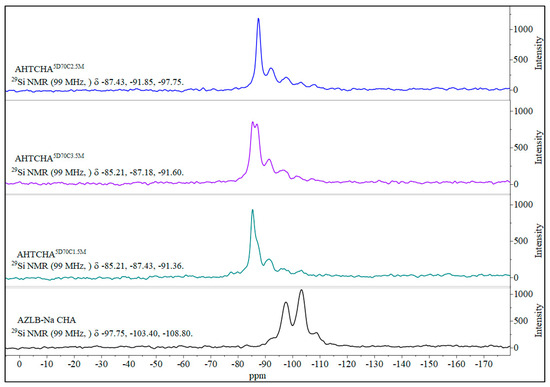 Solid-state 29Si MAS NMR of AZLB-Na CHA and AHTCHA5D70C1.5M, AHTCHA5D70C2.5M, and AHTCHA5D70C3.5M.