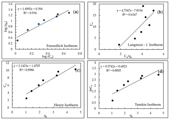 (a) Freundlich isotherm, (b) Langmuir-1 isotherm, (c) Henry isotherm, (d) Temkin isotherm.
