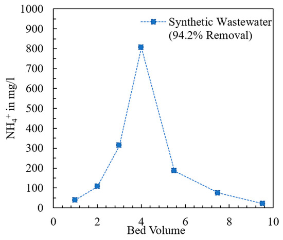 The breakthrough curve of the fixed bed containing the modified chabazite that was fed a synthetic wastewater sample is shown in Figure 9. The composition of synthetic wastewater is provided in Table 2. The break point (BP) and exhaustion point (EP) were chosen to be when the effluent concentration was 10% and 90% of the influent concentration, respectively. When the AHTCHA5D70C2.5M fixed bed was exhausted, it was regenerated with a 2.0 M NaCl solution. The regeneration curve is shown in Figure 10. It may be noted from the sharpness of the effluent profile that regeneration is highly efficient, with the recovery of >94% of the (loaded on the exhausted AHTCHA5D70C2.5M) in <10 BV. From the type of breakthrough curve, especially due to the gradual rise, it is evident that it has excellent CEC, and it gets exhausted gradually. A similar kind of performance of ion-exchange materials in a packed-bed column has been outlined by several researchers [62,63,64]. The regeneration profile (Figure 10) provides solid evidence of a concentrated ammonium solution that could be used as a stand-alone nitrogenous fertilizer or combined with potassium and phosphorus to create a commercial fertilizer. Admittedly, ammonium has to be separated from the saline regenerant solution (e.g., by distillation and recondensation) in order for it to be used as a fertilizer, but this is outside of the scope of this article. The main purpose of this article is to provide evidence that (1) the modified chabazite can be used as a selective ammonium ion-exchanger to remove ammonium from a solution that contains competing cations and (2) regeneration of this zeolite provides an ammonium-rich solution. The zeolite can be reused in the next exhaustion cycle. Studies conducted for three cycles (each cycle consists of an exhaustion and a regeneration step) have shown minimal loss of modified chabazite’s ion-exchange capacity, ammonium selectivity, or regeneration efficiency.