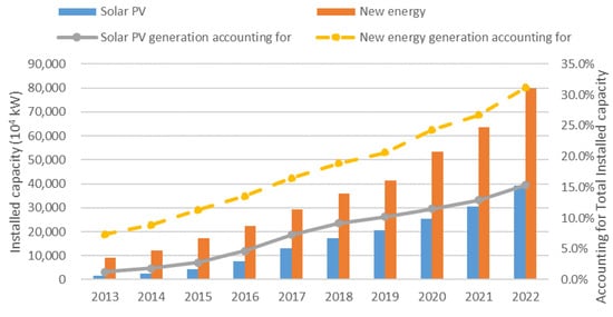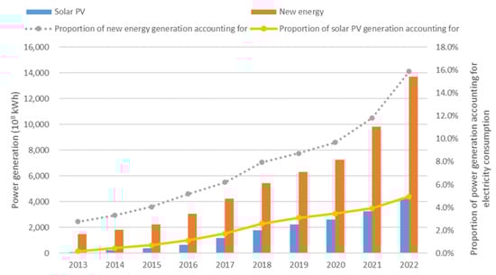 With the development of solar PV generation in China, the power generation of new energy continues to increase. The contribution of new energy generation to provide a driving force for the economic and social development of China is also increasing significantly. The total social electricity consumption of China was 8637.2 billion kWh in 2022 [52], an increase of 62.3% over 2013, with an average annual growth rate of 5.5%, which means that a substantial increase in China’s electricity consumption was achieved. China’s new energy generation reached 1372.3 billion kWh in 2022, an increase of 39.6% over 2021. In 2022, China’s new energy generation accounted for 15.9% of the total electricity consumption with an increase of 34.4% over 2021, and solar PV generation accounted for 4.9% of the total electricity consumption with an increase of 26.2% over 2021. Between 2013 and 2022, the proportion of new energy generation of the total electricity consumption increased by a factor of almost 476.4, with an average annual growth rate of 21.5%, and the proportion of solar PV generation of the total electricity consumption increased by a factor of almost 2825.4, with an average annual growth rate of 45.3%. New energy generation in China accounted for 15.9% of the total electricity consumption in 2022. China was part of the second-tier countries, which include the United States, with a share of 13% [53]. The first-tier countries with an internationally advanced level of new energy development are represented by countries like Germany, with 36% of the total electricity consumption.