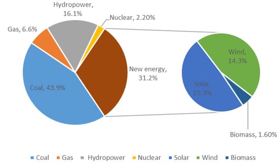 In the past decade, the installed capacity of solar PV generation in China has experienced rapid growth. In 2022, China’s cumulative installed capacity of solar PV generation reached about 393.5 million kilowatts (kW) [50,52] (as illustrated in Figure 1), with a 28.6% increase from 2021. The cumulative installed capacity of solar PV generation in China increased by 2380% in 2022 [52,53], with an average annual growth rate of 42.8% compared to that of solar PV generation in 2013. In 2022, the cumulative installed capacity of solar PV generation in China will account for 15.3% of the total installed power capacity, as shown in Figure 2. The cumulative installed capacity of solar PV generation related to the total installed power capacity has surpassed the share of hydropower, becoming the second largest cumulative installed capacity of the power supply. The cumulative installed capacity of wind power and biomass power generation accounted for 14.3% and 1.6% of the total installed power capacity, respectively [54,55,56]. Therefore, solar PV generation has become the largest installed new energy generation variety. Overall, the cumulative installed capacity of new energy generation in China reached about 799.5 million kW, accounting for 31.2% of the total installed power capacity. With the continuous advancement of the energy production revolution, clean and low-carbon energy represented by new energy generation has been positioned as a new resource to replace traditional high-carbon energy, and solar PV generation in China has rapidly advanced and developed in recent years.