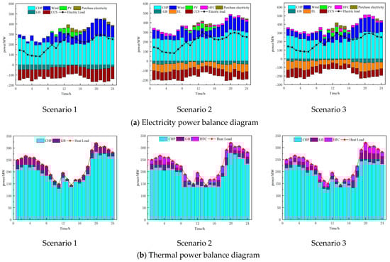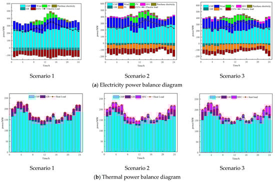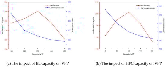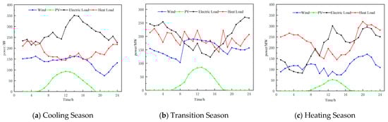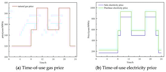 In the equation, i is the index of the CHP unit. θ is the total number of CHP units in the VPP. P c h p i ( t ) and H c h p i ( t ) are the electricity and heat output of the ith CHP unit at time t, respectively. P w i n d ( t ) and P p v ( t ) are the power output of the wind and photovoltaic power plants at time t, respectively. P E H ( t ) and H E H ( t ) are the electric-to-heat conversion power and heat supply power of the electric boiler at time t, respectively. P c c s ( t ) is the total energy consumption of the CCS at time t. P H F C , e ( t ) and H H F C , h ( t ) are the power output of the hydrogen fuel cell for electricity and heat supply, P e l ( t ) is the power consumption of the electrolyzer, respectively, at time t. P M g , g ( t ) is the output power of the methane reactor at time t. α ( t ) , β ( t ) and γ ( t ) are the selling prices of electricity, heat, and gas for the VPP at time t, respectively.