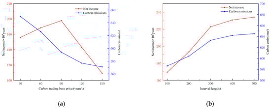 The tiered carbon-trading model adopts a tiered carbon price, which sets different carbon-emission ranges based on the difference between actual carbon emissions and carbon quotas. Each range corresponds to a different unit carbon-trading price. When the difference between actual carbon emissions and carbon quotas exceeds the set range, the carbon-trading price for the excess emissions also increases. The greater the difference, the higher the corresponding carbon-trading price. The cost calculation expression for the tiered carbon-trading model is as follows [32]: