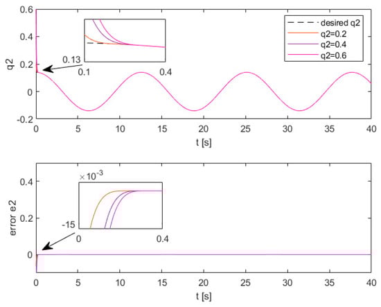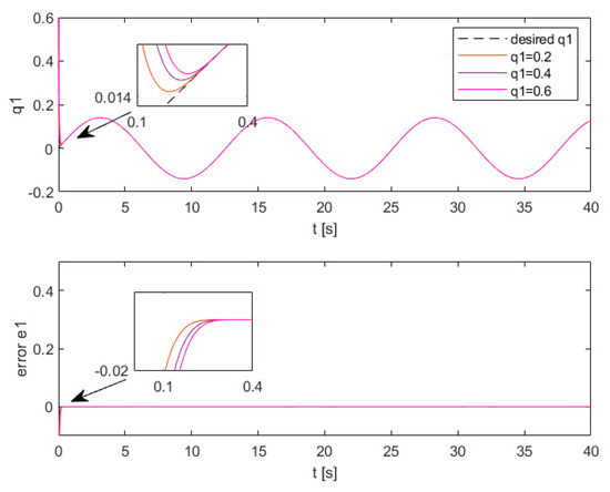 To verify that the convergence time of the system is independent of the initial state with the designed control law, the algorithm proposed in this article was validated with different initial states, , and , and the simulation results are shown in Figure 3 and Figure 4.