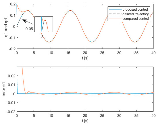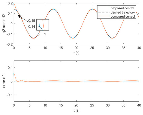 The trajectory tracking and error of joints 1 and 2 are shown in Figure 5 and Figure 6, where and represent the actual motion trajectory and desired motion trajectory of joint 1 of the robotic arm, respectively, and and represent the actual motion trajectory and desired motion trajectory of joint 2 of the robotic arm, respectively. By analyzing Figure 5 and Figure 6, it is evident that the control method proposed in this article exhibits higher accuracy in tracking errors and compared to the NSTSMC.