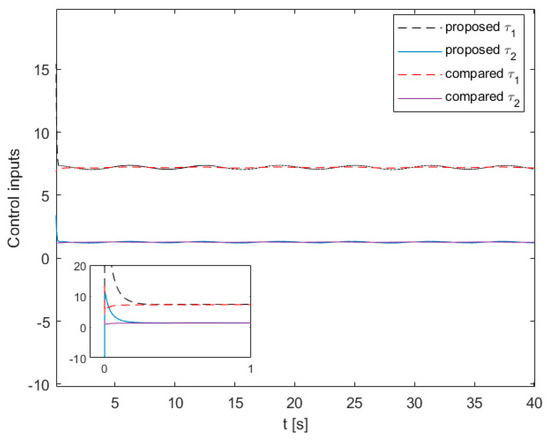 Additionally, both controllers successfully tracked the desired trajectory with favorable tracking response characteristics. Under both methods, the position error of the robotic arm achieved global time convergence. The convergence time of the NSTSMC was about 2.5 s, while the method in this article had a faster convergence speed of about 0.43 s, and the convergence time was less than the set time min () = 1.74 s. This is 82.8% faster than the NSTSMC. This indicates the superior tracking performance of the proposed control method in tracking the desired trajectory. In Figure 7, the control inputs based on the proposed control method in this article and the NSTSMC are shown. The black and blue lines represent the proposed control inputs, while the red and purple lines represent the compared control inputs. In the initial stage, the compared control inputs show less chattering than the proposed control inputs. When the system is stable, both control methods achieve stable control inputs. This indicates the robustness of the proposed control law with system uncertainties.