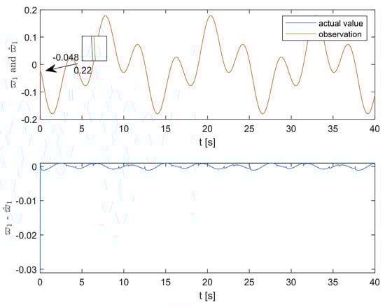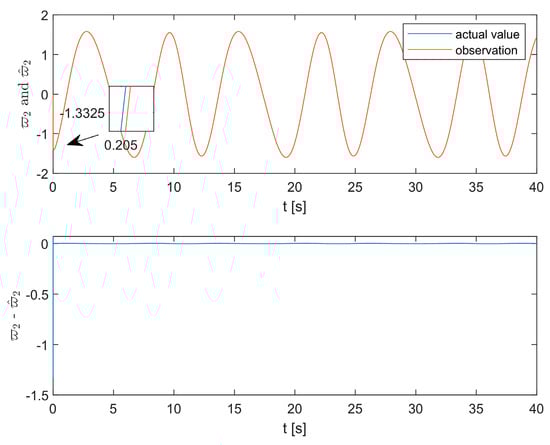 Figure 8 and Figure 9 show the observation effects of the system uncertainties of joints 1 and 2, respectively, where and represent the actual value and observed value of of joint 1, respectively, and and represent the actual value and observed value of of joint 2, respectively. By analyzing Figure 8 and Figure 9, it is evident that the designed disturbance observer can accurately estimate the system uncertainties present in the system, and real-time compensation can be performed on the control inputs, effectively enhancing the control precision and convergence speed of the system.