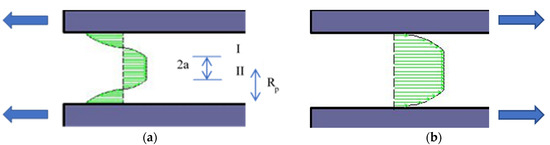 After some derivations, the fluid flow velocity profile for region (I) and (II) can be expressed as Equation (2):
