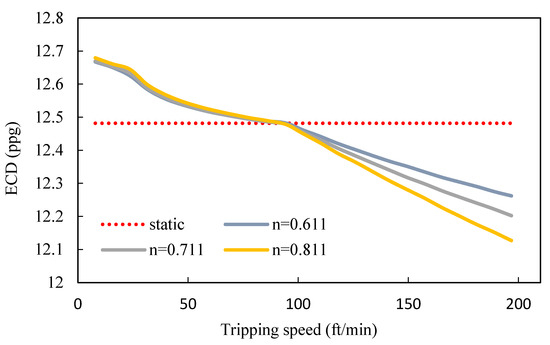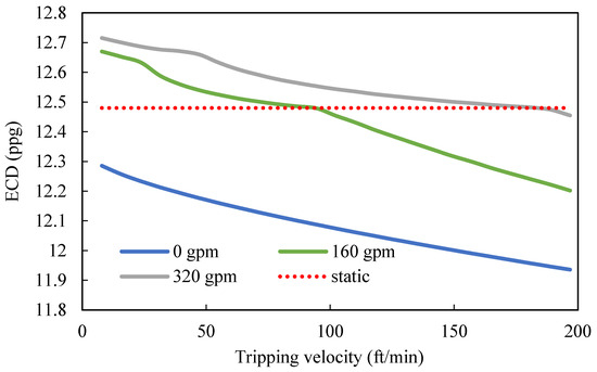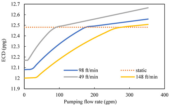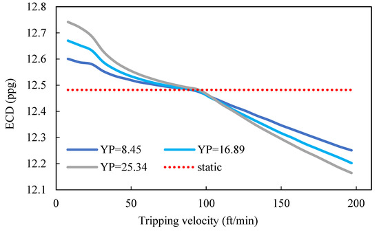 Figure 8 shows the effect of yield point on ECD at different tripping velocities. The pressure surge/swab is more severe for fluids with high yield points than fluids with low yield points. For fluids with high yield points, it takes more pressure to move it in the annulus, which leads to a lower ECD for inefficient pumping and a higher ECD for over-pumping. Therefore, accurately controlling the pumping flow rate is required for a high yield point fluid.