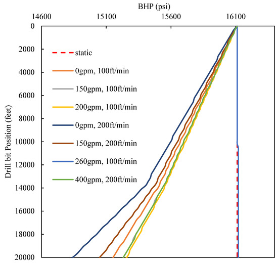 The pressure changes for tripping with fluid circulation (red plot in Figure 13) are different with no fluid circulation. In this case, the operation procedure is to turn on the fluid circulation before the tripping starts and turn off the fluid circulation after the tripping of one stand finishes. Therefore, there are pressure surges at the beginning and end of the tripping, which are caused by the fluid circulation. In fact, in this particular scenario, there is no need for concern regarding the pressure surge: the fluid circulation flow rate during tripping is less than the fluid circulation rate during drilling, which means the pressure surge here is much less than the pressure increase caused by the fluid circulation during drilling.