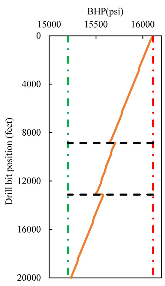 In Figure 15, it is assumed that the drill bit was positioned at the bottom hole at the start of the tripping operation, and the draw works have enough power to pull out the drill string at the given velocity. This plan is designed to trip out the drill strings at a constant high tripping velocity (200 ft/min). As shown in Figure 15, the whole tripping process has three periods: high pumping flow rate, low pumping flow rate, and no pumping. In this case, the pore pressure (green curve in figure) is about 890 psi lower than the hydrostatic pressure (red curve in figure). To keep the bottom hole pressure above the pore pressure during tripping, the pressure swab must be controlled within 890 psi. At the beginning, the clearance between the drill string and the wall of the well bore is narrow, and the length of the drill string inside the wellbore is very long. To avoid a severe pressure swab, the drilling fluid is circulated at 400 gpm. When the drill bit reaches the liner section of the well, the clearance becomes larger and the drill string length is shorter, the pumping flow rate can be lowered to 150 gpm. At last, the pumping is no longer needed at the last stage of the tripping.