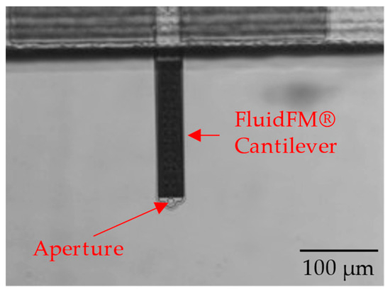 FluidFM® technology is based on Atomic Force Microscopy (AFM) but is differentiated by using specialized micro-channeled cantilevers (micropipettes) that are unique to FluidFM®. These cantilevers have closed channels that are connected to a pressure control system through tubing, enabling them to contain and deliver various types of liquids. This technology enables the accurate dispensing of a fluid into a liquid environment by controlling the pressure of the fluid channel through an aperture located at the tip of the cantilever (see Figure 2) [9,23,24]. The hydraulic system provides an adjustable pressure range that spans from −800 to 1000 mbar according to the manufacturer’s specification. Negative pressure is useful for fixing cells or particles to the micropipette, while positive pressure can be used to dispense controlled amounts of liquid from the micropipette. This wide pressure range enables flexibility and control in the process of fluid manipulation and dispensing, such as the creation of liquid droplets.