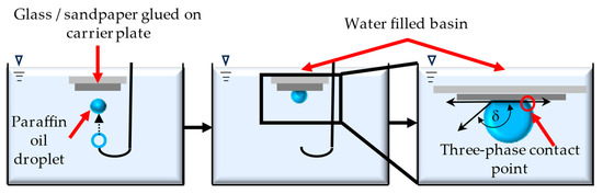 The sessile drop method is a fundamental technique for investigating the wetting characteristics of flat surfaces, providing a flexible strategy that can be applied to both planar and uneven surfaces, as described by Schreier et al. [25]. Instead of using individual particles, the cover glass or sandpaper is attached to a carrier plate using double-sided adhesive tape. The carrier plate is immersed in a water-filled basin and rotated to invert the model surfaces during this process. The deionized water is degassed prior to measurement in order to prevent the formation of unwanted gas bubbles on the surface, which could have a negative effect on the results. To initiate the measurement, a droplet of paraffin oil is dispensed using a needle attached to a micro syringe, which is released when the buoyancy force is sufficient. As the droplet rises, it collides with the surfaces, enabling a complete investigation of the wetting properties based on the contact angles at the three-phase contact points (see Figure 5) [25].