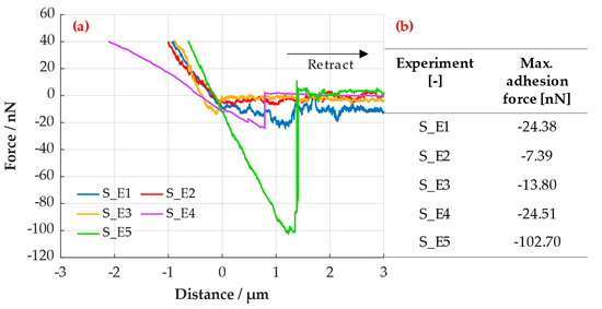 By way of comparison, force–distance curves were obtained between the droplet and a sandpaper surface with roughness. Rough surfaces are more challenging to measure than flat-glass surfaces due to their unevenness and varying voids. It is therefore likely that there will be significant variations in both the maximum adhesion force and the trajectory of the curve. These variations are supported by the force–distance curves from different experiments carried out at different locations on the sandpaper, as shown in Figure 7a. The experiments show a wide range of fluctuation in the maximum adhesion forces, from −7.39 nN to −102.70 nN (refer to Figure 7b).