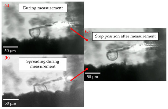 Exemplary horizontal images of the measurements against the sandpaper surface showing different behaviors of the droplet in contact with the surface, resulting in different slopes of the force–distance curves: (a) limited spreading of the droplet; (b) greater droplet deformation and spreading; and (c) similar behavior at stop position after the experiment.