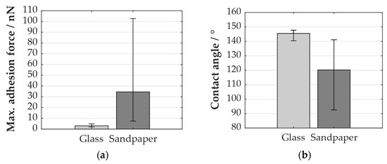 Comparison of the results: (a) maximum measured adhesion forces for five experiments carried out on the glass and sandpaper surface and (b) contact angles of five experiments for each of the model surfaces.