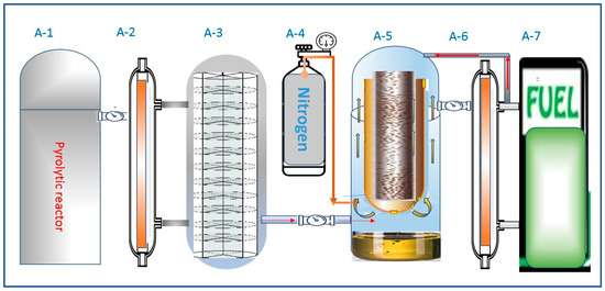 The dumped polyolefin used was in the shape of yogurt containers made from polypropylene and were collected from the dumping containers of the university canteen. After grinding and washing, the samples were dried for 48 h. The ground flakes’ size was maintained in this work at ~10 mm. The developed experimental set-up for the solid polyolefin pyrolysis-plasma-powered system was composed of a two-stage reactor system shown in Figure 1. Initially, solid polyolefin was pyrolyzed in a pyrolytic reactor (A-1), then the gas flow was pushed through the condenser (A-2). Post-pyrolyzed liquid was passed through the filter column (A-3) for the purpose of removing additional particulate impurities. The physical properties of the PP pyrolysis oil were as in [23]. Pyrolyzed oil was passed through the NTP reactor (A-5) with the help of nitrogen gas (A-4). It is worth mentioning that nitrogen was used as the carrier gas to avoid any side reactions during plasma treatment. The treated gas was passed through the subsequent condenser (A-6), which was connected with the fuel collection container. The additional gas was recycled back to the A-5 and continued until complete condensation was reached.