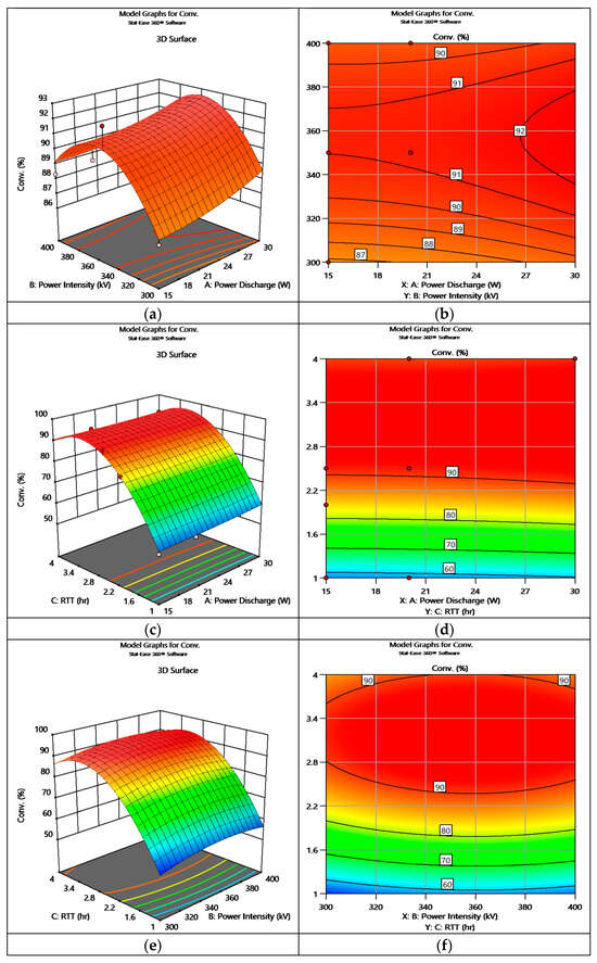 Figure 3c–f demonstrate the -dependent experimental results. Blue and red represent the lowest and the highest levels of Yconv%, respectively. This investigation aims to identify the maximum possible Yconv%; thus, response plots that show a reddish colour reflect the expected results. Figure 3c,d depict the effect of and on Yconv% while remain constant at the surface’s centre point. The values of other Yconv% showed systematic-distributed ascending trends when the values of and reached a certain threshold. Therefore, Figure 3c,d depict a 3D response surface and 2D contour map for these experiments, which highlight the maximal Yconv% value. The Yconv% exhibits increasing trends from 2.3 h to 3.5 h (), then reaching a stationary plateau, although the value of increased up to 4 h (), wherein the optimal Yconv% range was seen to range between 88.51 and 90.67%, taking into account the x1 fluctuation. A significant increase was seen between 15.5 and 20.0 W. An abrupt but equal reduction in Yconv% was observed when values ranged between 25 W and 30.0 W, demonstrating the effect of electrical noise from the other two factors, . These results helped in developing the HV NTP system and determining the tuning range for and .