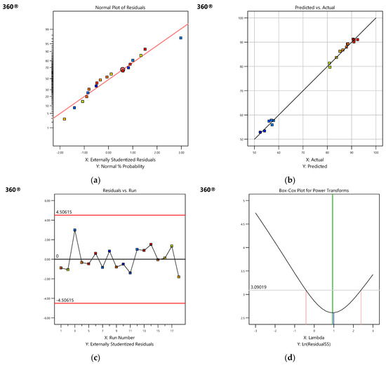 The State-Ease 360® software offers a diagnostic Box–Cox plot. This graph (Figure 5d) presents a reference to determine the appropriate λ value to select the power law transformation. In Figure 5d is shown the natural log plot of the sum of squared residuals (ln residual SS) versus the λ values that ranged between −3 and +3, at intervals of 0.2. The optimal λ value corresponds to the smallest ln residual SS value, which generates a scale that satisfies the equal variance condition of the ANOVA model. This value was limited by the upper and lower 95% confidence intervals. If the 95% confidence interval for this λ includes λ = 1 (i.e., no transformation), the software cannot recommend any particular transformation. If not, a specific λ is suggested. Responses less than zero cannot be subjected to power law transformations; in such cases, a constant (k) was added to every response. The proposed transformation yields the smallest value for ln residual SS. Furthermore, the researchers applied the Box–Cox graph transformation (Figure 5d) to assess if data transformation was required for better response modelling. The actual value (λ = 1) was seen to lie between the low and high confidence ranges (−2.89 and 1.34), indicating no need for model transformation. This observation implies that there was no variance and that the analytical assumption was fulfilled.