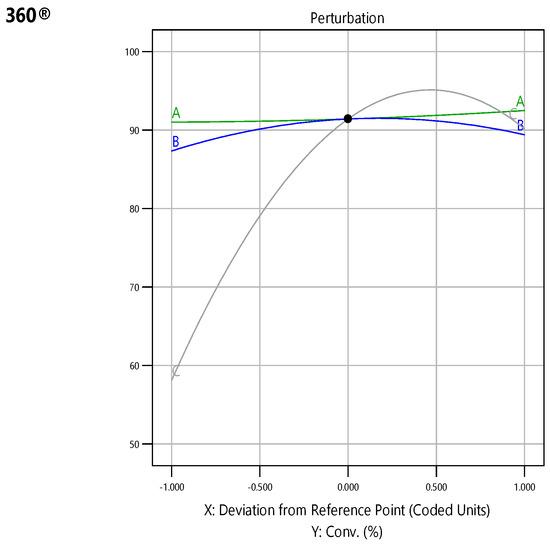 A perturbation plot represents a statistical visualisation technique used to determine the dominance of independent factors on the response, which was essential for creating an NTP power structure for Yconv%. It employed the design plot’s centre point. Furthermore, this plot allows the researchers to easily compare the significance of several variables (, , and ). Figure 6 displays the perturbation plot for the Yconv% response using four inputs, namely (A), (B), and (C). This graph focuses on the influence of a single variable, with response values displayed by changing the value of one factor from its optimum point while holding the values of the other variables as constant.