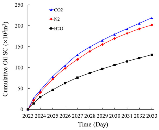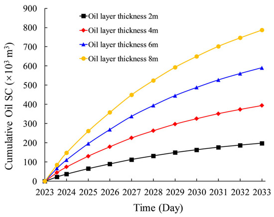 It can be seen from Figure 4 that the cumulative oil production is obviously affected by the thickness of the oil layer. With the increase in oil layer thickness, the cumulative oil production increases continuously, and there is no obvious decreasing law in the range of 2 m, 4 m, 6 m, and 8 m. The thicker the reservoir, the higher the cumulative oil production.