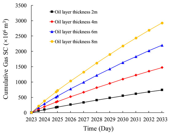 Under the condition that other parameters remain unchanged, the reservoir thickness of the theoretical model is changed, and the values are 2 m, 4 m, 6 m, and 8 m. The curves of cumulative oil production and cumulative gas production with time are obtained, as shown in Figure 4 and Figure 5.
