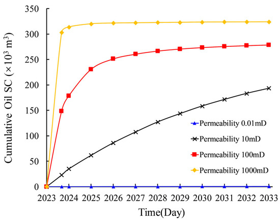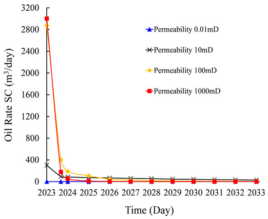 The permeability of the reservoir affects the flow capacity of the fluid, and then the development effect of the reservoir. Therefore, it is necessary to analyze the influence of permeability on the development effect of condensate in the reservoir [34]. Under the condition of other parameters remaining unchanged, the horizontal permeability of the model is changed to 0.01, 10, 100, and 1000 mD, so as to study the influence of different levels of permeability on daily oil production and cumulative oil production. The curves of daily oil production and cumulative oil production under different penetration conditions are shown in Figure 6 and Figure 7.