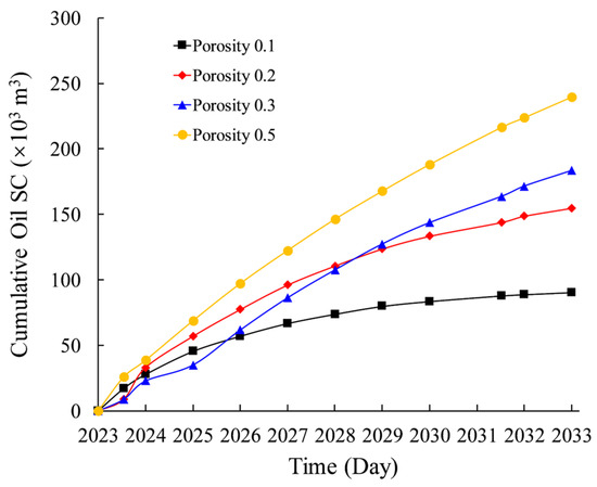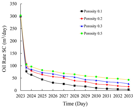 Under the condition that other parameters remain unchanged, different porosity changes in the model are made: 0.1, 0.2, 0.3, and 0.5. Curves of daily oil production and cumulative oil production with dates are shown in Figure 8 and Figure 9.
