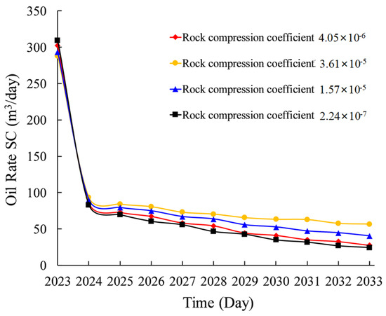 It can be seen from Figure 10 that different rock compression coefficients have a great influence on the development of condensate reservoirs. The smaller the rock compression coefficient, the greater the daily oil production of condensate gas in the early stage; with the development of mining, the daily oil production decreases rapidly. The larger the rock compression coefficient is, the slower the daily oil production decreases in the later stage.