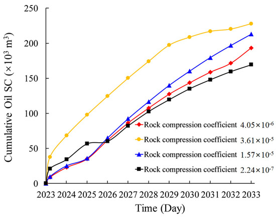 The mining dynamics of condensate gas reservoirs in the high-pressure mining stage mainly depend on the release characteristics of rock elastic energy. The rock compressibility is greatly affected by the clay content in the reservoir. The measured rock compressibility is usually used to predict the productivity performance [35,36,37]. The rock compressibility coefficient is the main parameter used to adjust reservoir energy. Under the condition of other parameters remaining unchanged, different rock compression coefficient changes are made: 4.05 × 10−6, 3.61 × 10−5, 1.57 × 10−5, and 2.24 × 10−7. Daily oil production and cumulative oil production curves with dates are shown in Figure 10 and Figure 11.