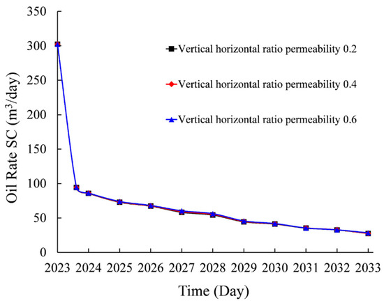 The vertical permeability of condensate reservoirs affects the flow capacity of crude oil and gas caps. Under the condition that other parameters remain unchanged, the ratio of vertical permeability to horizontal permeability of the model is set to 0.2, 0.4, and 0.6. The curves of the daily output and cumulative oil production of condensate with different vertical permeability levels are studied, as shown in Figure 12 and Figure 13.