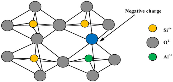Zeolite is derived from the Greek words (zein), “to boil,” and (lithos) “stone,” and literally means “boiling stone” [29]. Zeolites are crystalline hydrated aluminosilicates of alkali and alkaline earth metal cations, characterized by notable properties such as a highly regular and open microporous structure [30,31]. The two primary components of zeolites are SiO2 and Al2O3, which are interconnected by shared oxygen atoms. The arrangement of these components in the tetrahedral configurations of SiO4 and AlO4 results in various types of zeolites. Four oxygen atoms are covalently bonded to a central Al or Si atom [32]. The general chemical formula of natural zeolites is (M2/nO·Al2O3·xSiO2·yH2O), where x equals two or more depending on the connection of tetrahedral AlO4 units only to SiO4 units, and n is the cation valence (mainly potassium, sodium, calcium, and magnesium) [33] (Figure 1). Table 1 shows the types of natural zeolites.