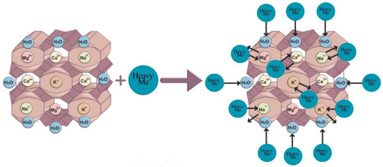 Heavy metal pollution of wastewater is a significant problem for developing countries as these elements are widely present in waste from various industrial sectors [105]. Zeolites possess high surface activity and the ability to retain metals due to their molecular structure. The mechanism of heavy metal adsorption from wastewater by natural zeolites occurs through ion exchange [106]. In this process, heavy metal ions in the wastewater are attracted to the negatively charged surface of the zeolite particles. These heavy metal ions then replace the exchangeable ions on the zeolite surface, effectively trapping the heavy metals and removing them from the water. Additionally, the porous structure of natural zeolites facilitates the physical adsorption of heavy metal ions on the surface and within the pores of the zeolite particles. This provides additional adsorption sites for heavy metal ions, enhancing removal efficiency. Overall, the adsorption of heavy metals by natural zeolites is an effective and environmentally friendly method for treating wastewater contaminated with heavy metals. The mechanism of adsorption of heavy metal ions using natural zeolites is illustrated in Figure 4.