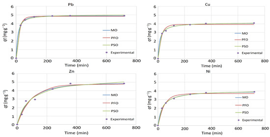 As can be seen from Figure 5, the kinetic models exhibit varying degrees of alignment with the experimental data. The mixed-order model (MO) demonstrated the highest accuracy in describing the adsorption processes for Cu2+ and Ni2+ ions. In contrast, the adsorption of Pb2+ and Zn2+ ions was better described by the pseudo-second-order (PSO) and pseudo-first-order (PFO) models, suggesting differences in the adsorption mechanisms for these metals.
