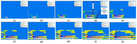 Distribution of mining-induced elastic-plastic zone in overburden rock: (a) Exc. 20 m; (b) Exc. 40 m; (c) Exc. 60 m; (d) Exc. 80 m; (e) Exc. 100 m; (f) Exc. 120 m;(g) Exc. 140 m; (h) Exc. 160 m; (i) Exc. 180 m; (j) Exc. 200 m.