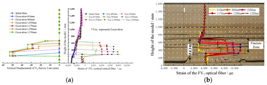 Strain of FV2 vertical optical fibers and vertical displacement of V4 survey line with different excavation distances in the experiment: (a) comparison chart; (b) strain curve characterization of the WCFZ projection diagram.