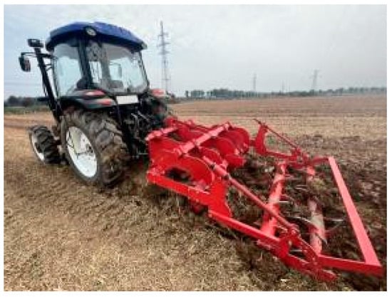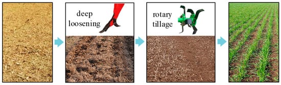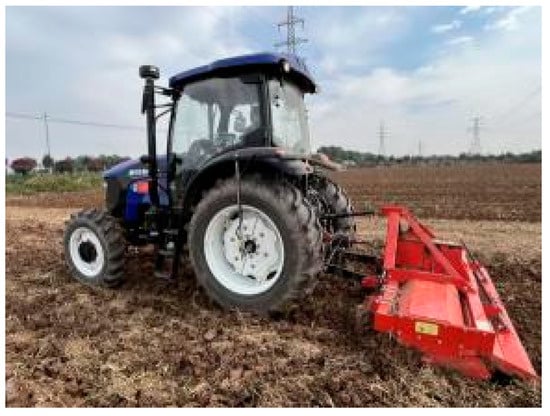The experimental site is situated in the Guanzhong District, Shaanxi Province, China, which is a representative area characterized by a one-year, two-season rotation of corn and wheat cultivation with arid and semi-arid climatic conditions. The soil type is yellow clayey soil. Tillage and land preparation are crucial steps in ensuring a favorable growth environment for crops. In order to create a good soil structure and sowing environment, it is necessary to carry out closely connected operations such as deep loosening and rotary tillage. For the farmland after straw returns, deep loosening is employed to effectively break the hard plow layer, achieving vertical connectivity between the upper and lower soil layers, enhancing soil water-holding capacity, and promoting deep root penetration of plants. Immediately afterward, the rotary tillage is implemented to meticulously achieve a soft surface soil structure, laying a solid foundation for the subsequent sowing operations, as shown in Figure 9. The two modes complement each other and together form an ideal soil cultivation layer, providing excellent environmental conditions for crop growth. On the same piece of land where the previous crop has been harvested, deep loosening is performed first, followed by rotary tillage. Meanwhile, the general operating parameters are selected for filed experimental tests based on agronomic standards and tillage and land preparation from national standards, and the operation mode and quality meet the growth requirements of crops.