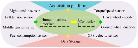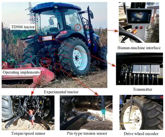 The load acquisition system mainly consists of a torque sensor, pin-type tension sensor, torque connector, signal receiver, acquisition module, and upper computer. The system configuration is shown in Figure 5, which can realize real-time collection and processing of sensor data, parameter configuration, data file storage, fault detection of the acquisition module, and other functions. The torque sensor can be directly connected to the output shaft of the tractor to test torque and speed in real-time. Three tension sensors are set on the three-point suspension system of the tractor, respectively, which are transmitted to the upper computer of the load acquisition system through the connecting line, and the resultant force of the operating tension can be calculated according to the operating attitude angle.