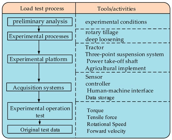 The field load during tractor operation is influenced by various factors, such as implement types, soil conditions, and the driver’s skill. The same typical soil environment is selected, the standard tillage and land preparation methods are adopted, and the mainstream agricultural machinery and tools are used to conduct load testing, such as deep loosening and rotary tillage. Meanwhile, to ensure consistency in load testing for each operating scenario, the load tests were conducted under the same conditions and location. The general scheme of such an approach is represented in Figure 6; according to the information provided in reference number [], the approach is used to collect the load data of rotary tillage and deep loosening on the same farmland.
