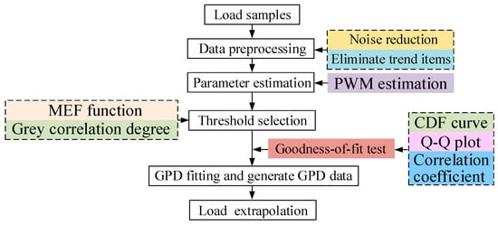 After validating the proposed threshold through goodness-of-fit analysis for the GPD, the extreme value obtained from the actual operation conditions can be used to further extrapolate the possible theoretical extreme, enabling bidirectional extrapolation of both maximum and minimum values. This process expands the range of load coverage and enhances the overall effectiveness. The extrapolation process is shown in Figure 8.